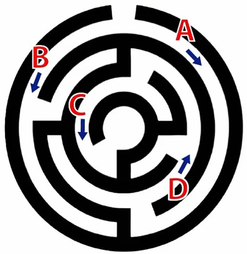 Four people are in a maze trying to reach the centre. Which of them is going the wrong way?